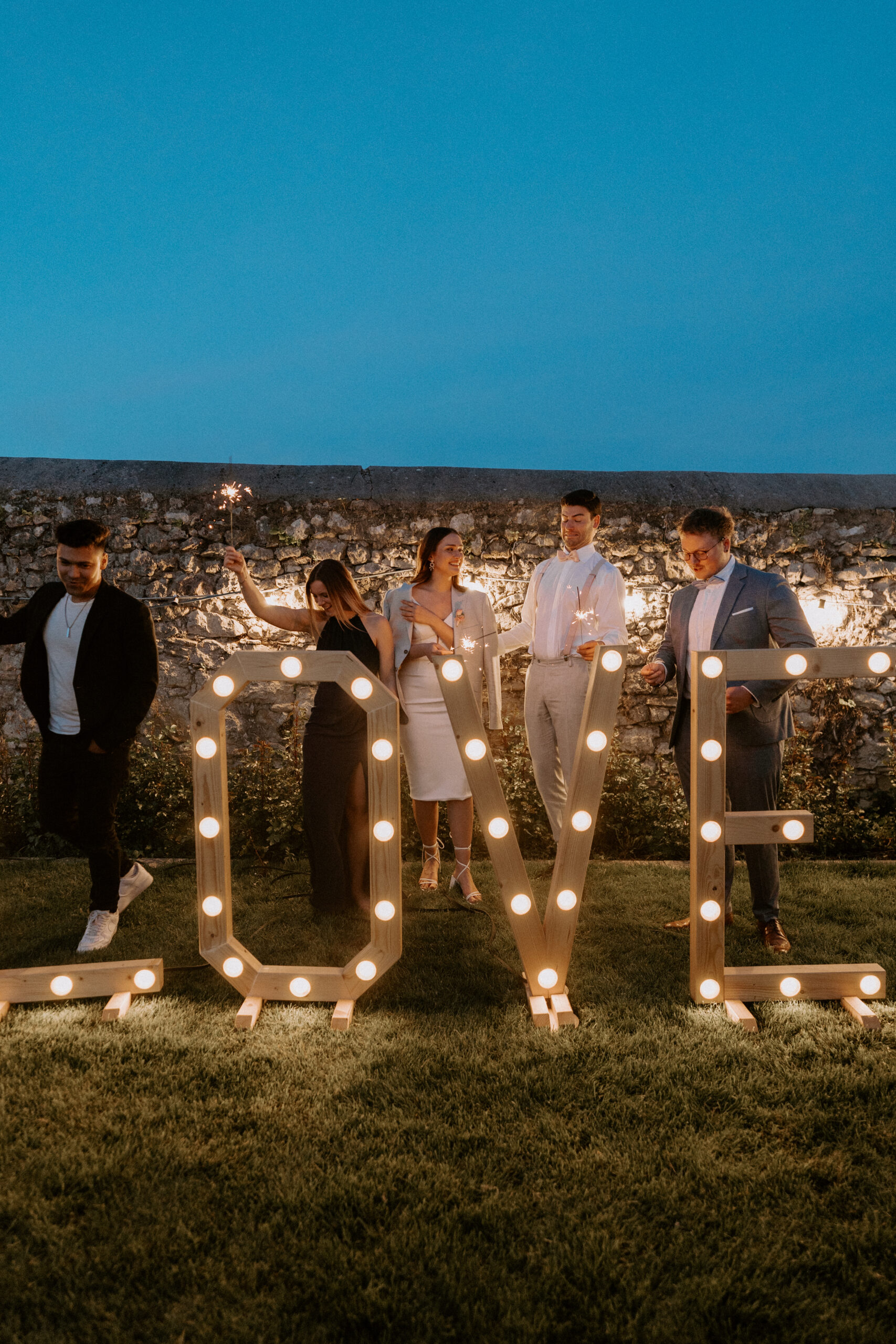 Überlegt auch, ob ihr Feuerschalen oder eine Feuerstelle einrichten wollt. Das sorgt für Wärme und eine Stelle, um die sich Gäste versammeln können. Besonders auf einem Weingut oder bei einer Outdoor-Hochzeit mit rustikalem Charakter passt das gut zur Jahreszeit.