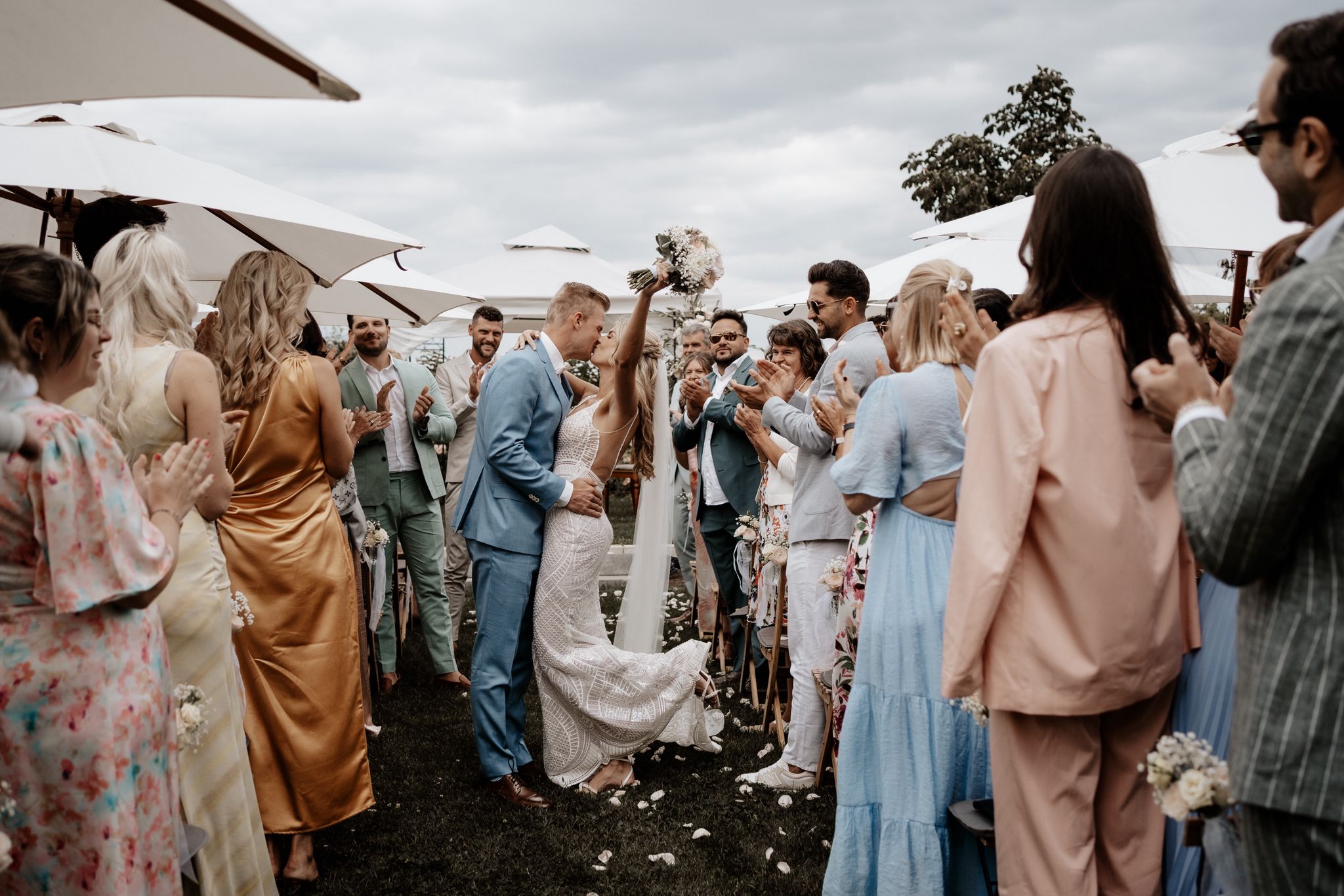 Statt einer einzelnen Feier erleben Gäste ein komplettes Wochenende mit verschiedenen Programmpunkten: ein Get-together am Freitag, die Hochzeit am Samstag und eine entspannte Verabschiedung am Sonntag. Jede Etappe bekommt ihren eigenen Charakter – vom gemeinsamen Grillabend über die freie Trauung im Weingut bis zum Gruppenfrühstück am Ende.